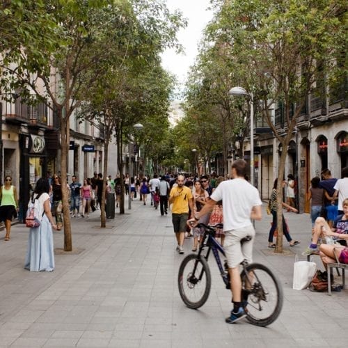 Calle peatonal llena de tiendas de marcas variadas desde Brandy, Blanco, a tiendas glamour como: Michael Kors, Calvin Klein Jeans, Pepe Jeans, Loewe etc.