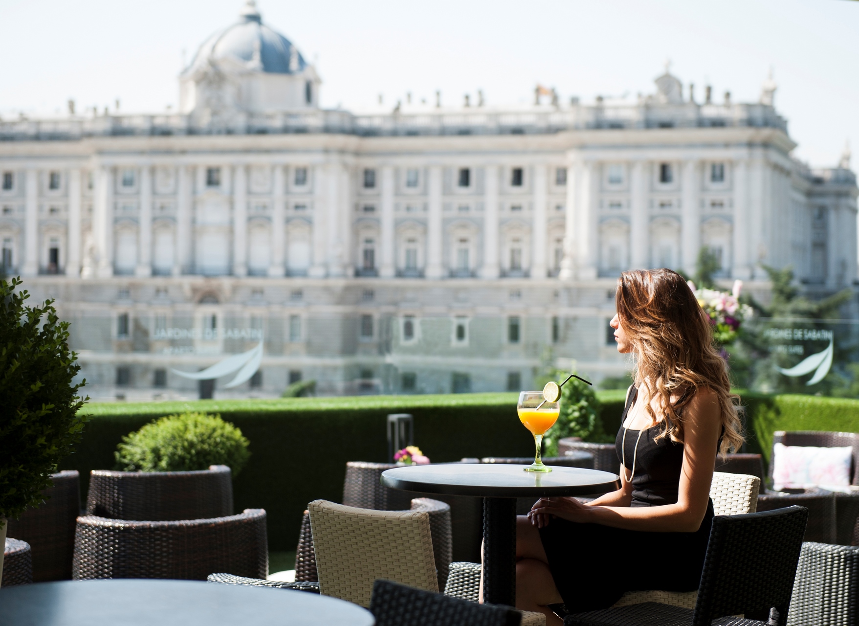 En la azotea del hotel ApartoSuites Jardines de Sabatini se encuentra nuestro secreto mejor guardado, la exclusiva Terraza Sabatini. Un lugar único donde podrá disfrutar de las mejores vistas del Palacio Real y de los atardeceres más mágicos de Madrid hacia el Templo de Debod. De mayo a septiembre relájese en nuestro ambiente chill-out y disfrute del verano de Madrid con nuestra amplia oferta de cócteles y bebidas. Para más información o para confirmar fechas de apertura del servicio de Bar Coctelería: